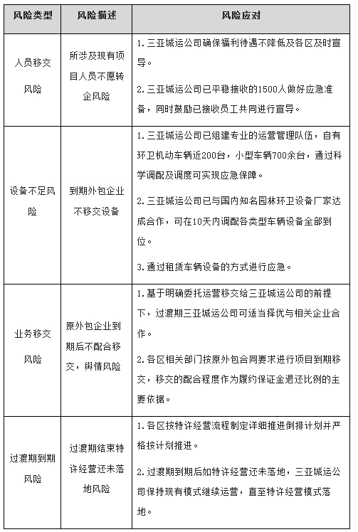 推动园林环卫运营机制改革涉及一定的潜在风险,为降低风险,相关部门应在业务移交前做好充分准备,按照业务风险可控原则,本方案梳理潜在风险及风险应对如下: