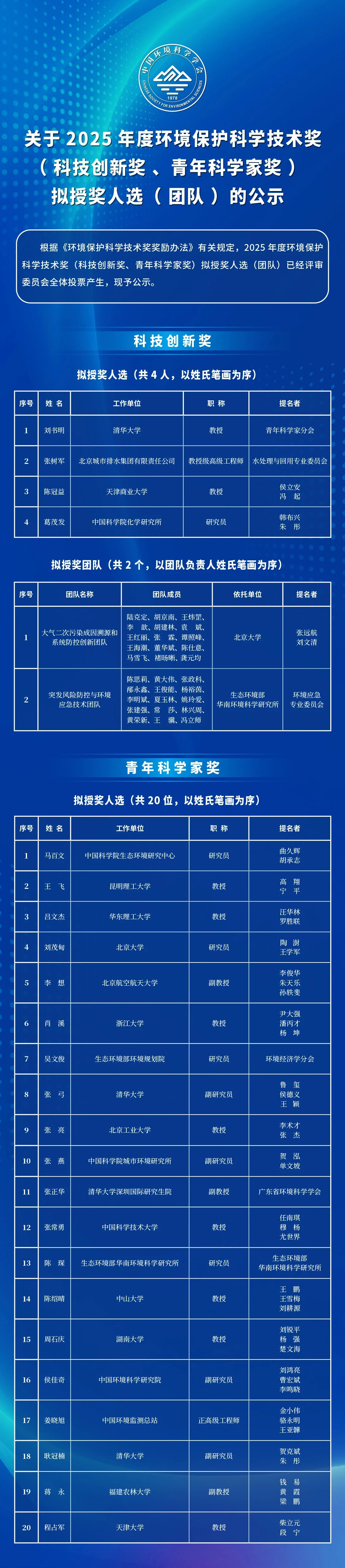 根据《环境保护科学技术奖奖励办法》有关规定,2025 年度环境保护科学技术奖(科技创新奖、青年科学家奖)拟授奖人选(团队)已经评审委员会全体投票产生,现予公示。其中,科技创新奖拟授奖人选4人,拟授奖团队2个;青年科学家奖拟授奖人选20位。