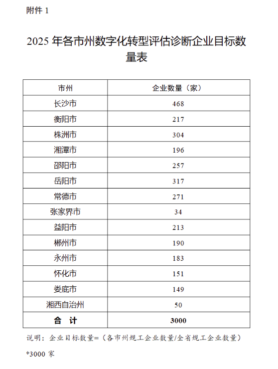 对具有数字化转型意向的工业企业实施评估诊断。2025年度诊断企业数量为3000家左右,各市州诊断企业目标数量详见《2025年各市州数字化转型评估诊断企业目标数量表》(附件1,以下简称《目标数量表》)。已获得国家中小企业数字化转型城市试点资金支持的企业,不重复纳入评估诊断范围。